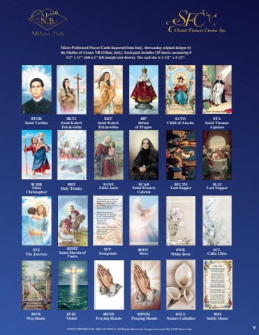 Micro-Perforated Prayer Cards Imported from Italy, showcasing original designs bythe Studios of Cromo NB (Milan, Italy). Each pack includes 125 sheets, measuring 81/2\%u00a92025 CROMO N.B. MILAN ITALY All Rights Reserved. Images Licensed By CNB Basevi Inc. 98VISVision8HTHoly Trinity8KT2Saint KateriTekakwitha8FPFootprints8ANESaint Anne8KTSaint KateriTekakwitha8HNDPraying Hands8DOVDove8IPInfantof Prague8CABSaint FrancisCabrini8HND2Praying Hands8WRWhite Rose8FC331Last Supper8ATOChild of Atocha8NCLNature Callallies8CLCalla Lilies8LS2Last Supper8TASaint ThomasAquinas8WHWayHome8CHRSaintChristopher8TJThe Journey8TORSaint Toribio8SHSafely Home8SMTSaint Martin ofTours