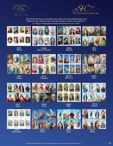8MILMilano8QOHQueen of Heaven8REQRequiem8RNIReni8TRITrinity8VELVelasquez8HVN2Heaven 28DOLDolceMicro-Perforated Prayer Cards Imported from Italy, showcasing original designs by theStudios of Cromo NB (Milan, Italy). Each pack includes 125 sheets, measuring 8 1/2\11\%u00a92025 CROMO N.B. MILAN ITALY All Rights Reserved. Images Licensed By CNB Basevi Inc. 118LIPLippi8LRDLord8OROORO8NURNurture8IMMImmaculate8GLRGlory8CLOCielo8STOSantos