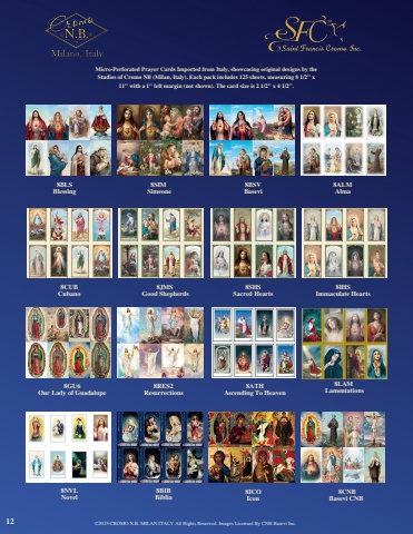 8BLSBlessing8SIMSimeone8BSVBasevi8ALMAlma8CUBCubano8JMSGood Shepherds8SHSSacred Hearts8IHSImmaculate Hearts12 %u00a92025 CROMO N.B. MILAN ITALY All Rights Reserved. Images Licensed By CNB Basevi Inc.Micro-Perforated Prayer Cards Imported from Italy, showcasing original designs by theStudios of Cromo NB (Milan, Italy). Each pack includes 125 sheets, measuring 8 1/2\11\8GU6Our Lady of Guadalupe8RES2Resurrections8NVLNovel8BIBBiblia8ICOIcon8CNBBasevi CNB8LAMLamentations8ATHAscending To Heaven